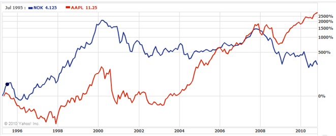若把NOKIA下滑的分水嶺放在2007.01.09 APPLE 發表iPhone這天上,截至昨天為止,NOKIA的股價大約只剩50%(下圖藍線),同時期Apple的股價上揚了278%(下圖紅線),回憶NOKIA過往的風光,如今的確是非常落魄。